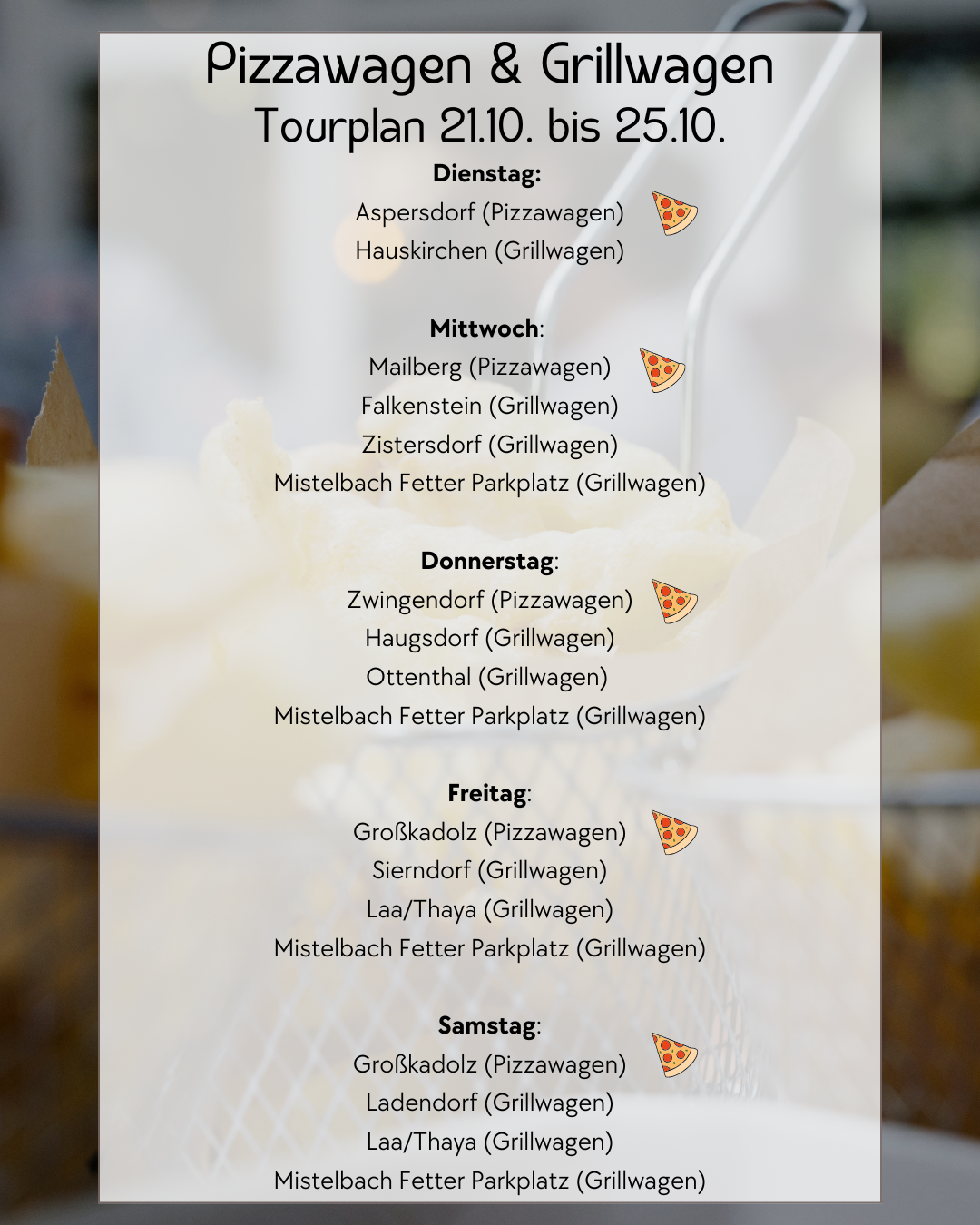 Dazu müssen Sie das Formular ausfüllen und den unteren Abschnitt beim Pizza- oder Grillwagen abgeben. Wir nehmen Sie anschließend in unseren Verteiler auf.